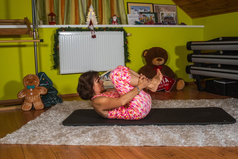 Végrehajtás: belégzésre páros lábad kinyújtod hosszan 45°-ban, miközben a karok fül mellé nyúlnak. Kilégzésre a térdek visszahúznak a mellkashoz, a kezek egy félkört leírva vissza a sípcsontokra.